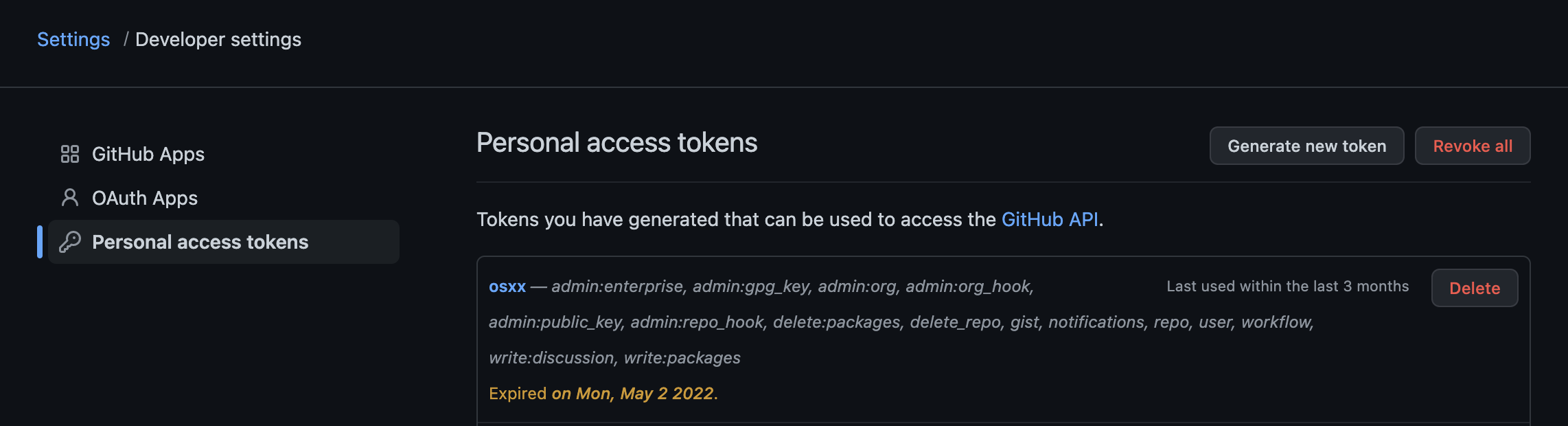 3. Personal access tokens 에서 Generate new token 버튼을 누른다