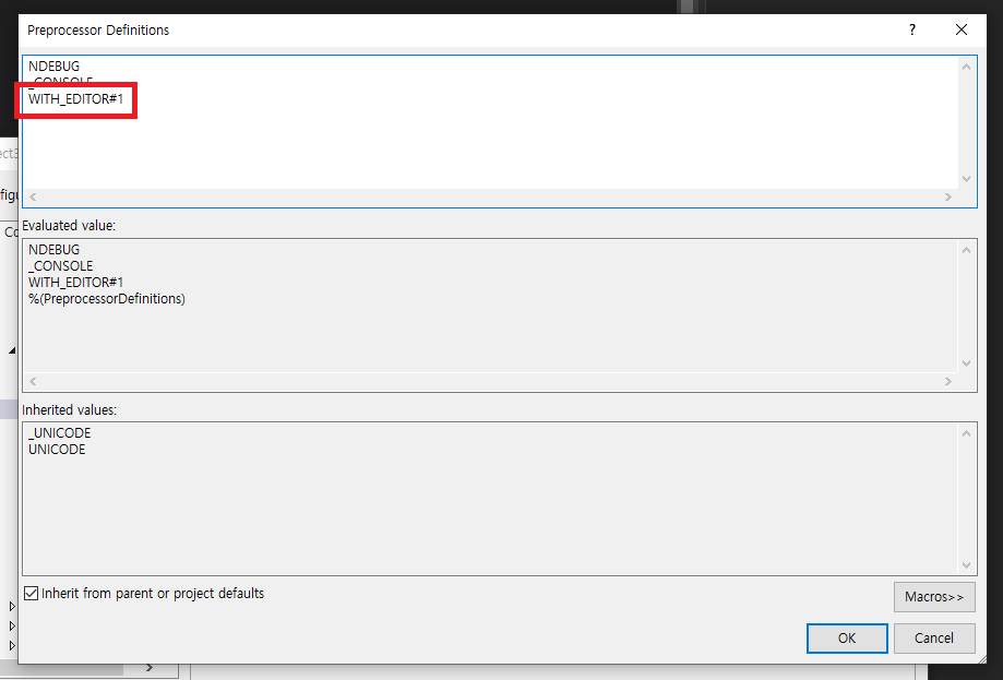 예시로 에디터에서 사용한다는 WITH_EDITOR 를 정의하고 싶다면 Preprocessor Definition 에 다음과 같이 입력한다