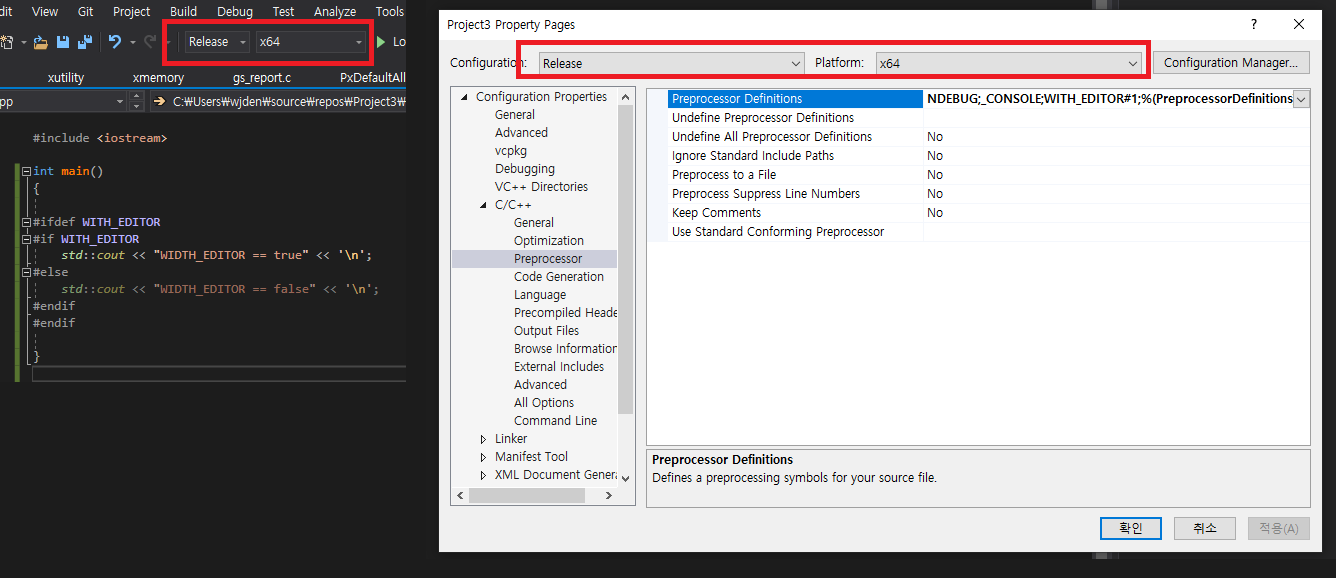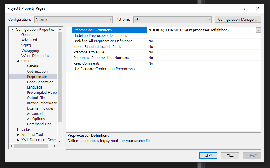 visual studio c++ #define set preprocessor value ( 전처리기 변수 VS 에서 설정하기 )