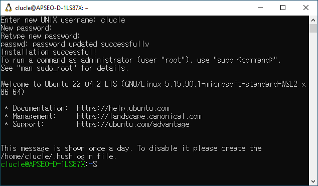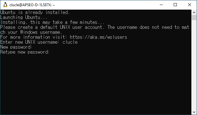 재부팅 후 사용할 Id, Password 를 이용하면 wsl 설치를 완료합니다.
