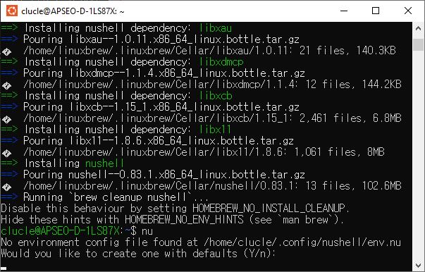 nu shell 을 설치하기 위해서 Linux 에서 사용하는 패키지 매니저 brew 를 설치합니다.
