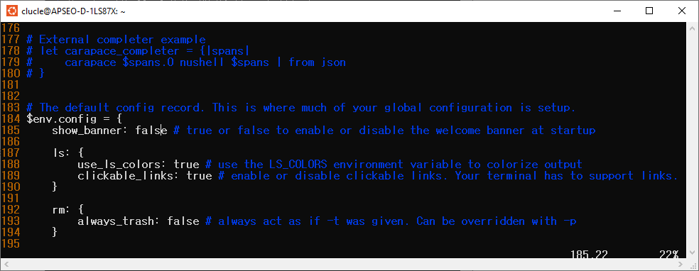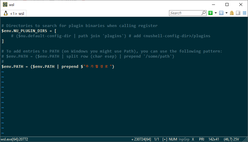 창을 다시켰을때도 유지하고 싶다면 env.nu 에 추가한다.