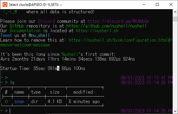 이후 창을 닫고 새로 실행하면 nu shell 을 기본 shell 로 사용할 수 있습니다.